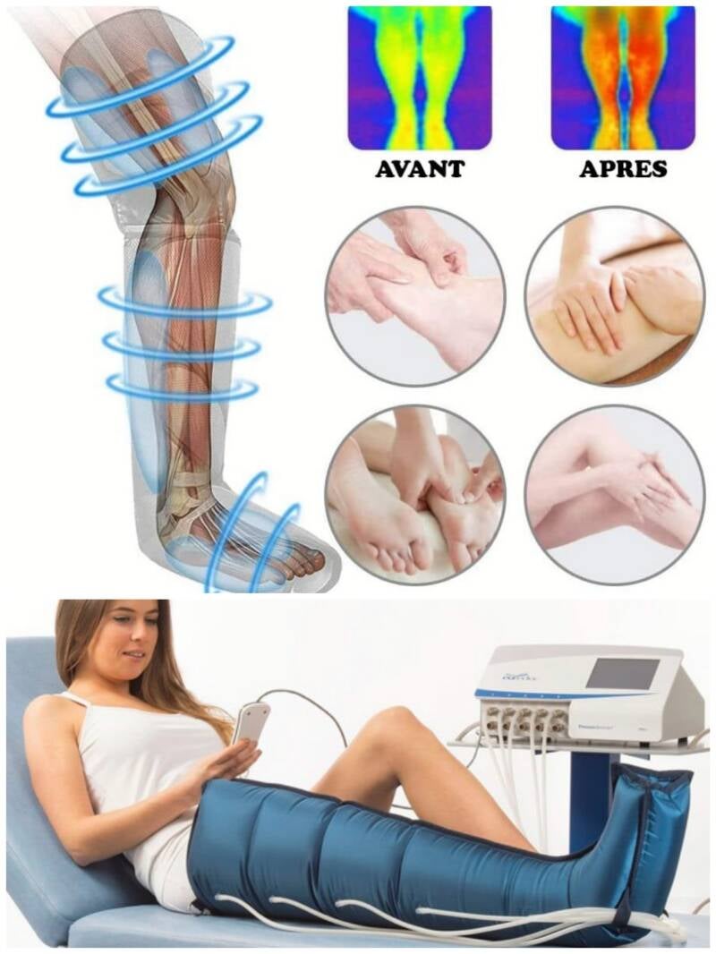 Cette thérapie est exercée par le moyen d'un appareil électrique qui va transmettre aux manchons (bottes, manchons pour les bras et ceinture abdominale) une pression.